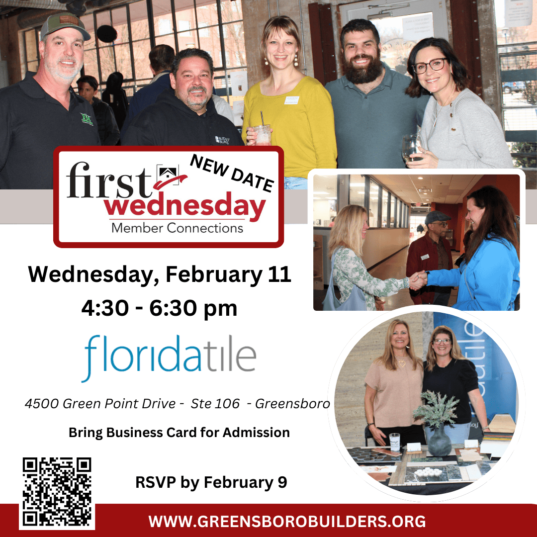 Florida Tile 4500 Green Point Dr Ste 106 - GreensboroJoin us as we kick off the year with our First Wednesday Member Connections on Wednesday, February 11 from 4:30 – 6:30 pm sponsored and hosted by Florida Tile located at 4500 Green Point Drive - Ste 106 - Greensboro. First Wednesdays are informal networking socials providing opportunities to meet other industry members and make new business connections.… Read More